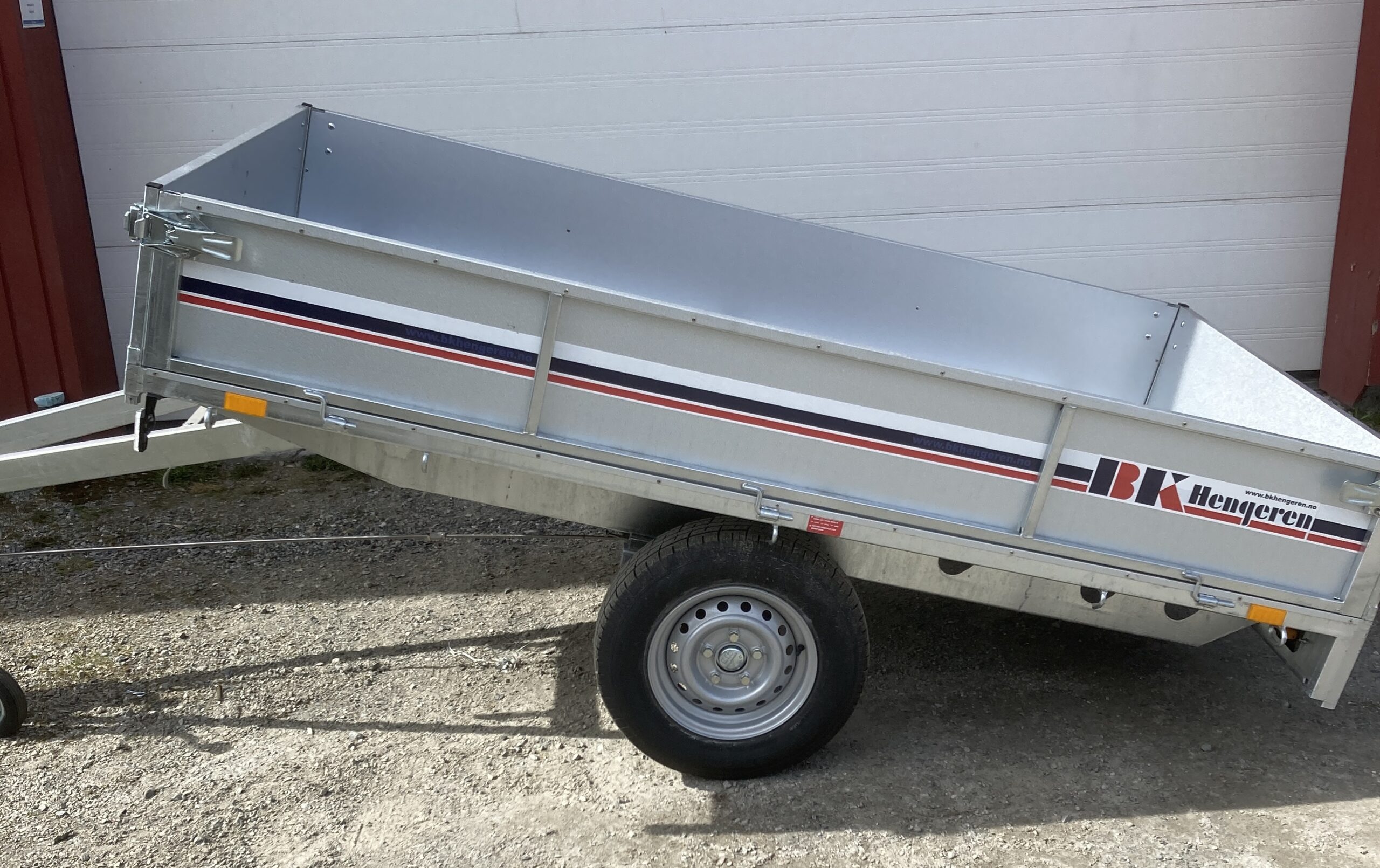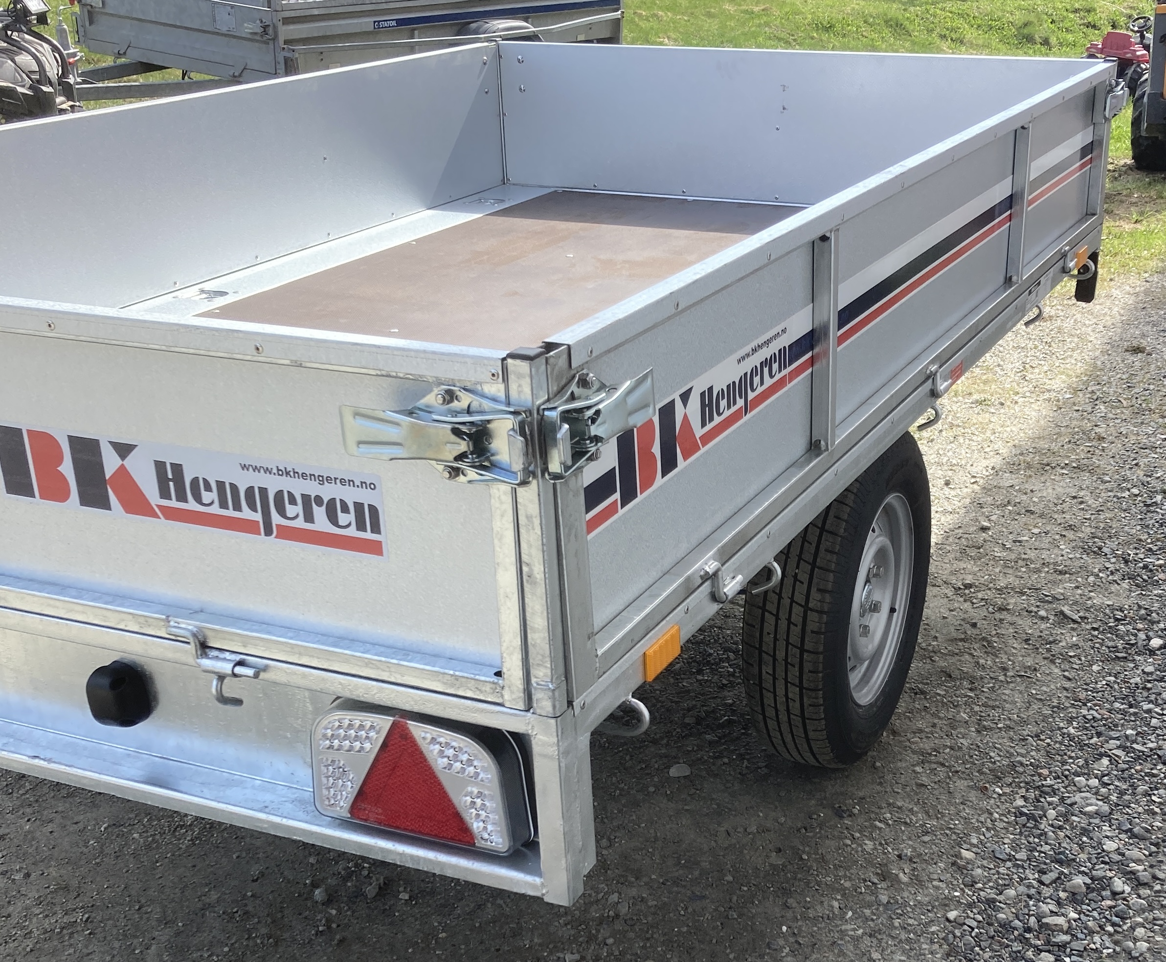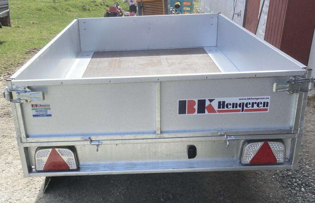 Henger leveres med forsterkede, nedfellbare sidekarmer/forluke/bakluke.