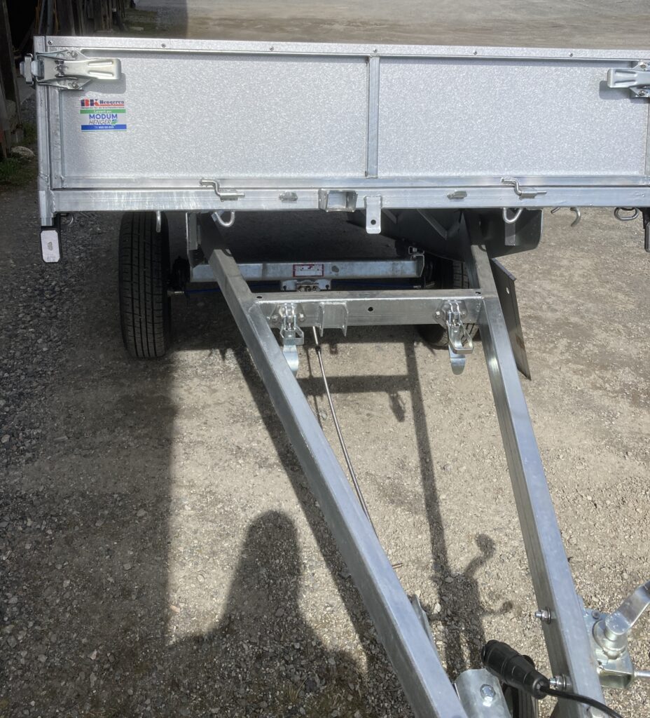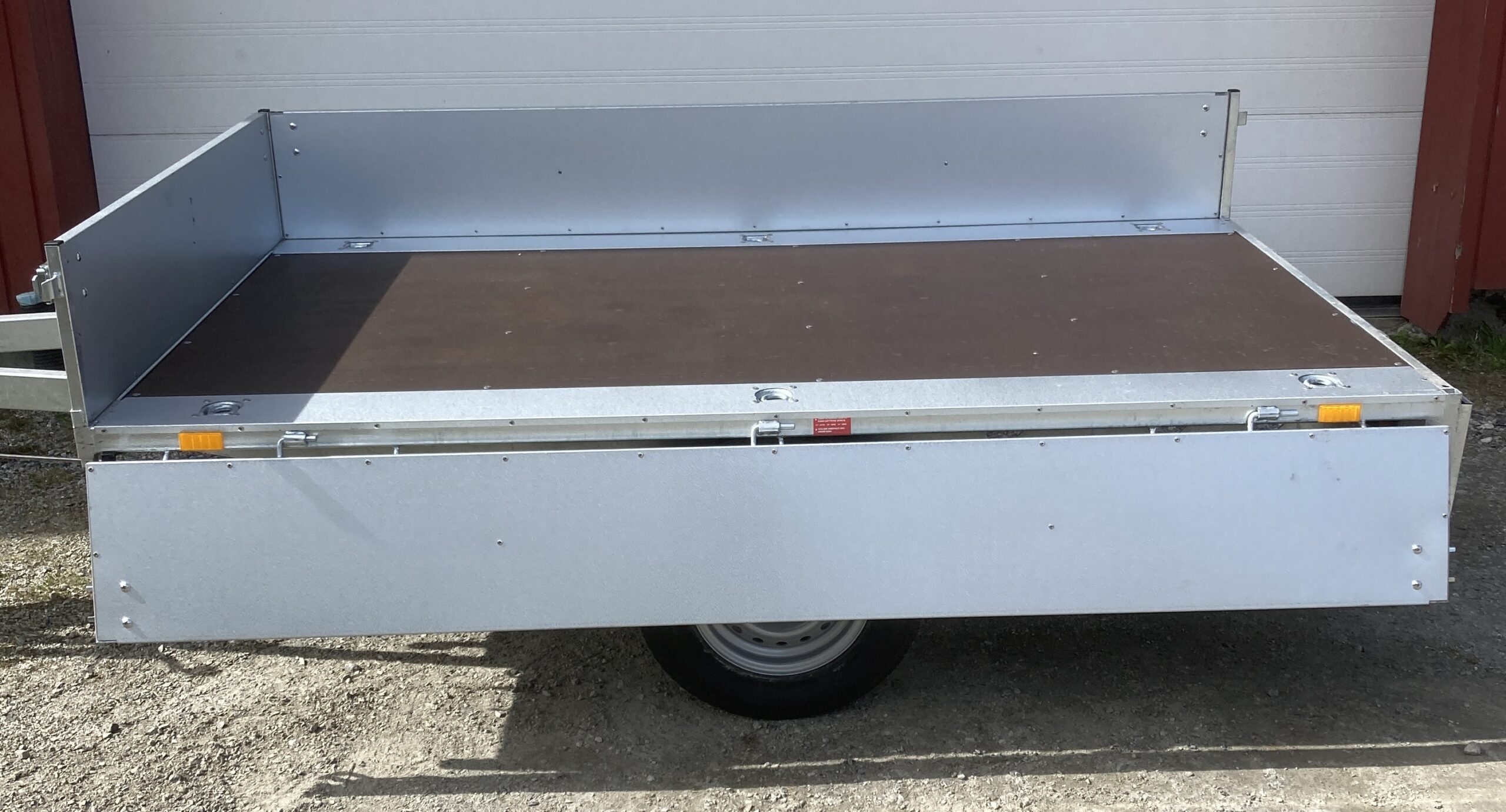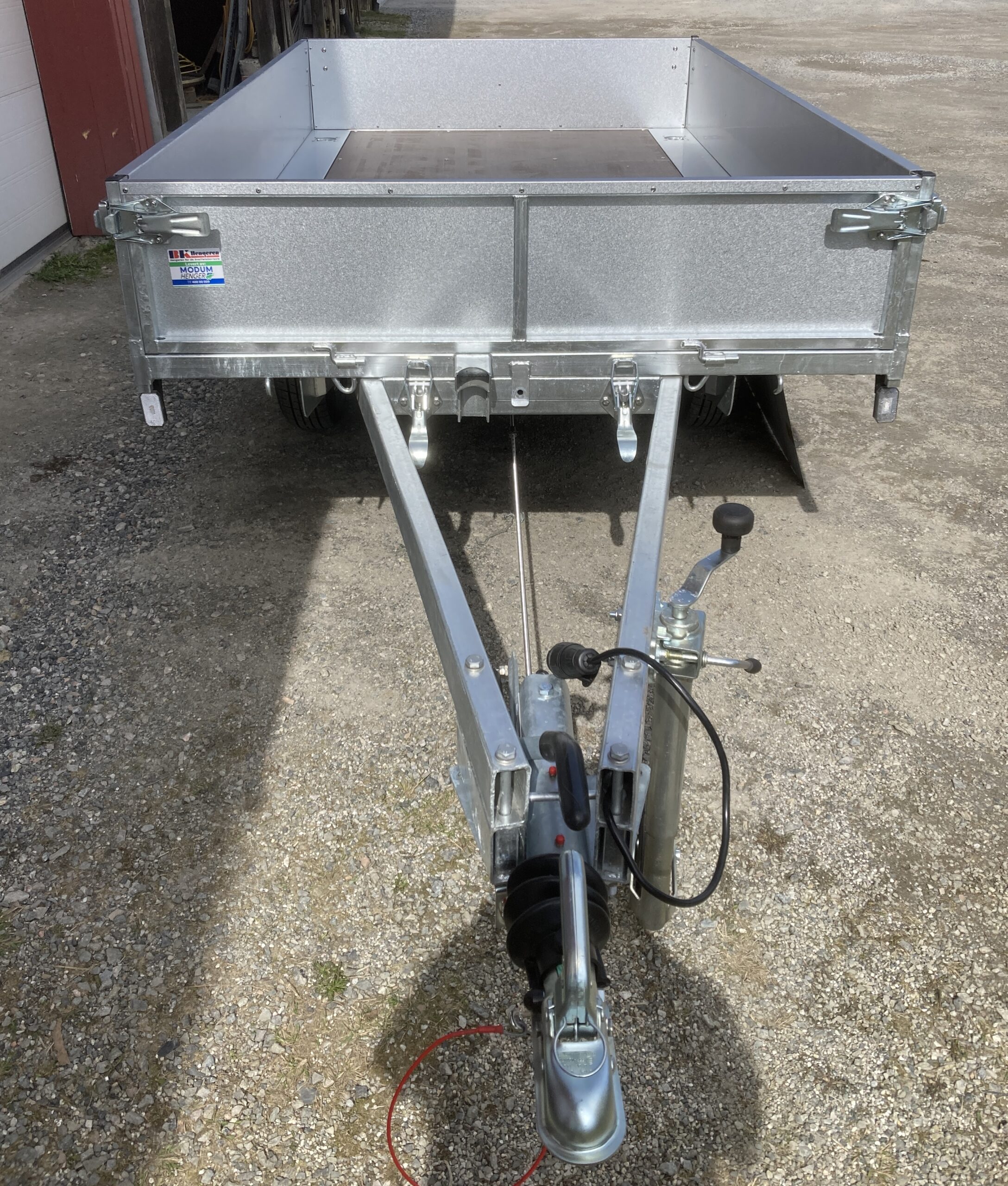 Henger leveres med forsterkede, nedfellbare sidekarmer/forluke/bakluke.