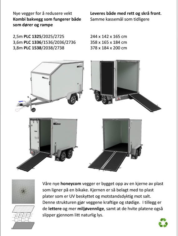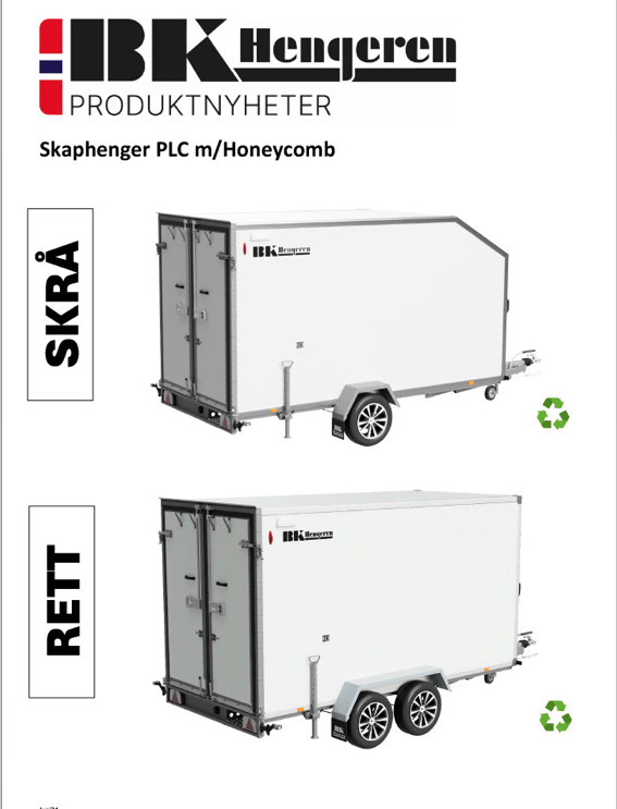 Skaphengeren leveres med Honeycomb-vegger, som gir en optimal kombinasjon av lav vekt og høy styrke. Denne strukturen gir ekstra stivhet og holdbarhet, samtidig som den reduserer vekt, noe som gir bedre lastekapasitet og drivstofføkonomi. Hengeren har skrå tak som ytterligere forbedrer drivstofføkonomien. Den er også utstyrt med LED-lys for økt synlighet og sikkerhet. Sidedør kan leveres som tilleggsutstyr.
